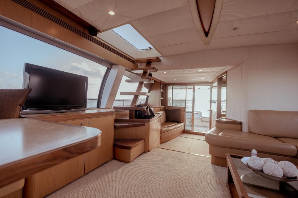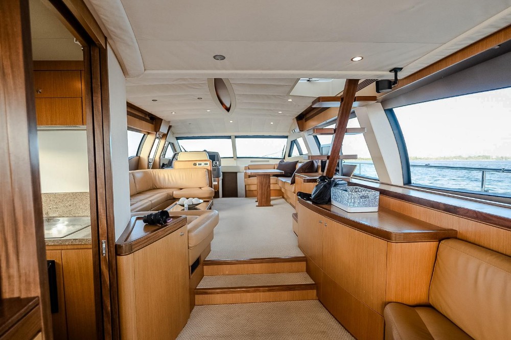 The flybridge is one of the largest in her class which features a full wet-bar, sun lounging areas, and forward seating with commanding visibility for owner-operators. Below, the aft-galley configuration connects the cockpit and salon seamlessly, ideal for entertaining or extended cruising.