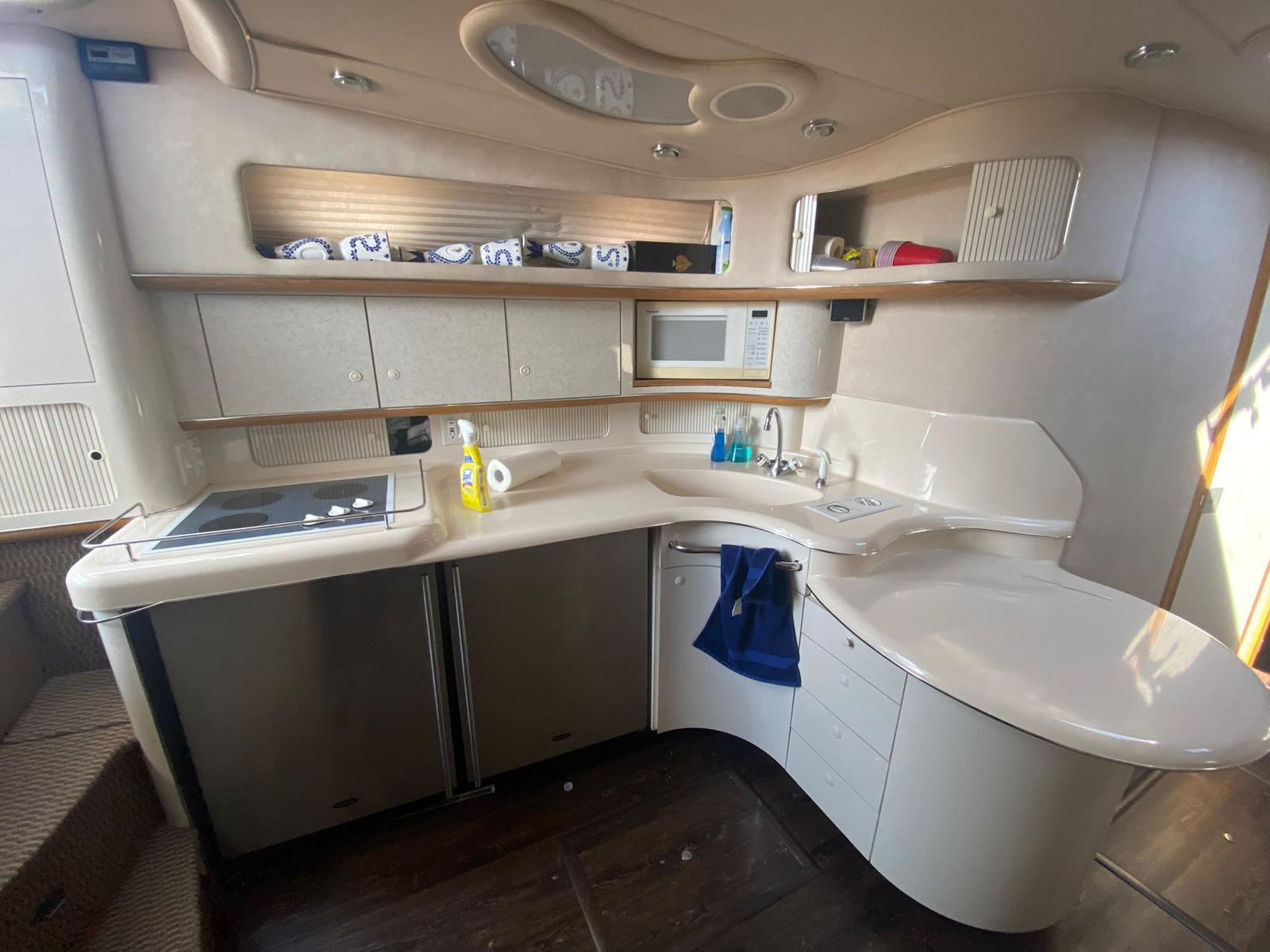 Galley: Fully equipped for onboard cooking, including a stove, microwave, refrigerator, and ample counter space.