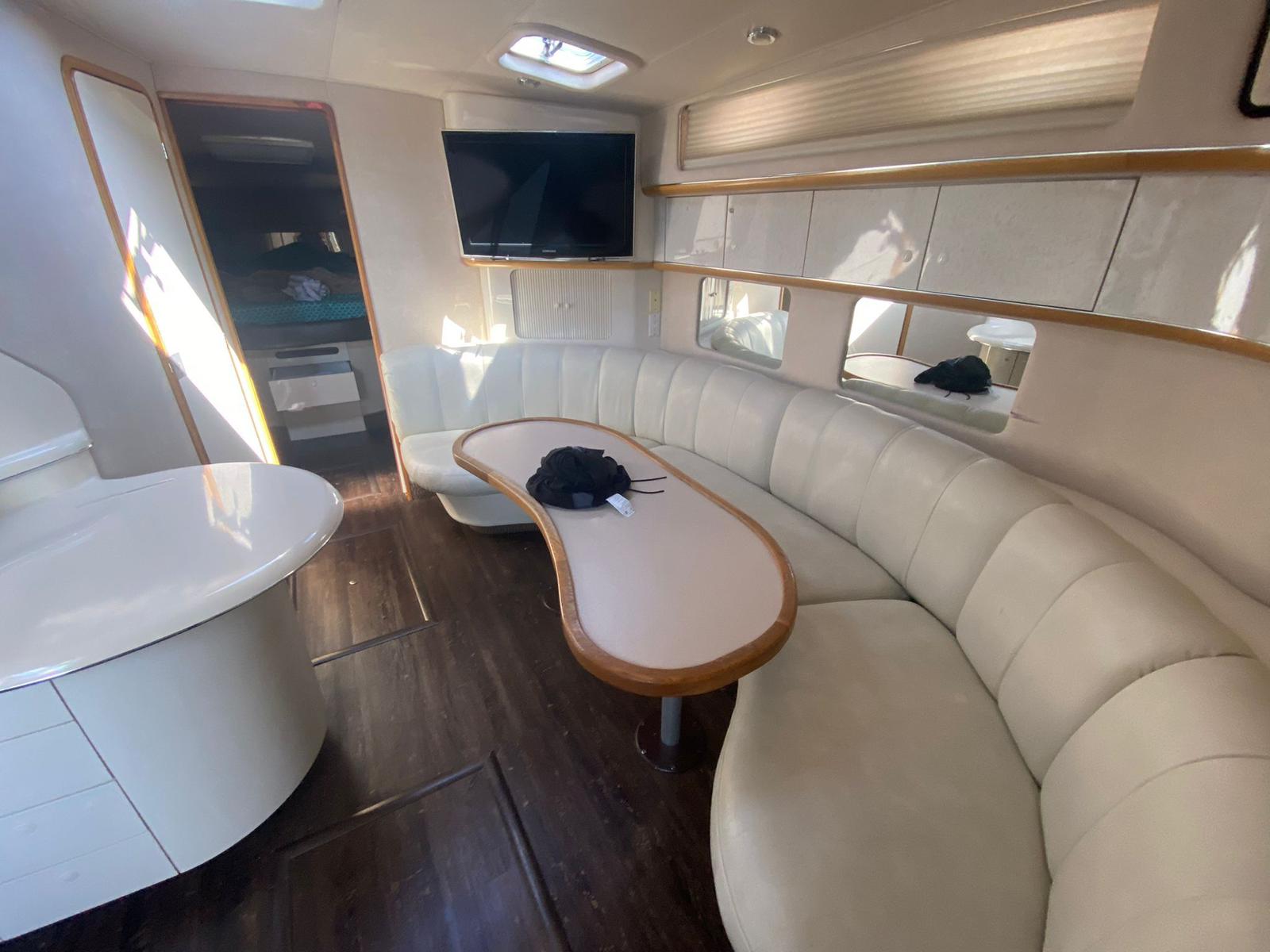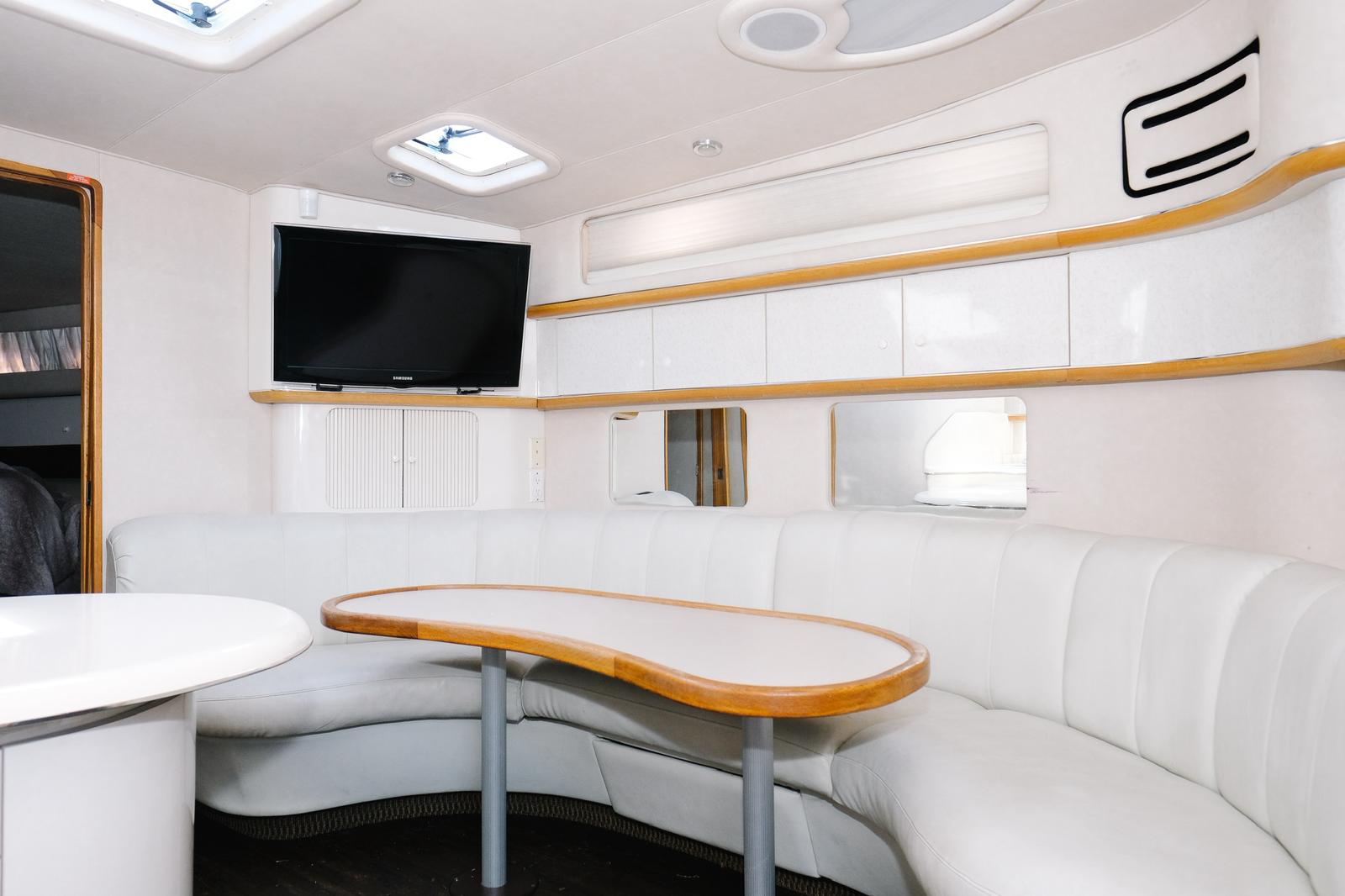 Main Salon: Open, airy salon with a convertible settee, entertainment center, and easy access to the galley.