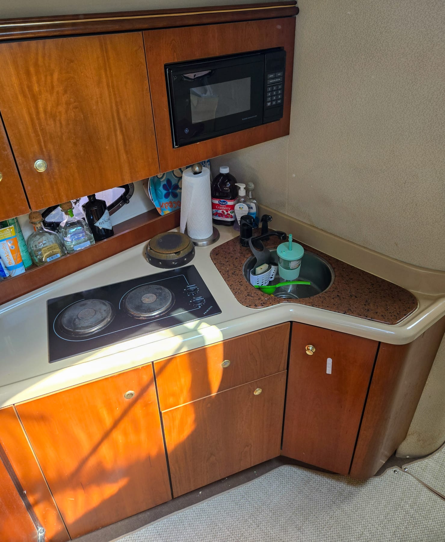 – Full galley with large refrigerator & freezer, microwave, stove, sink