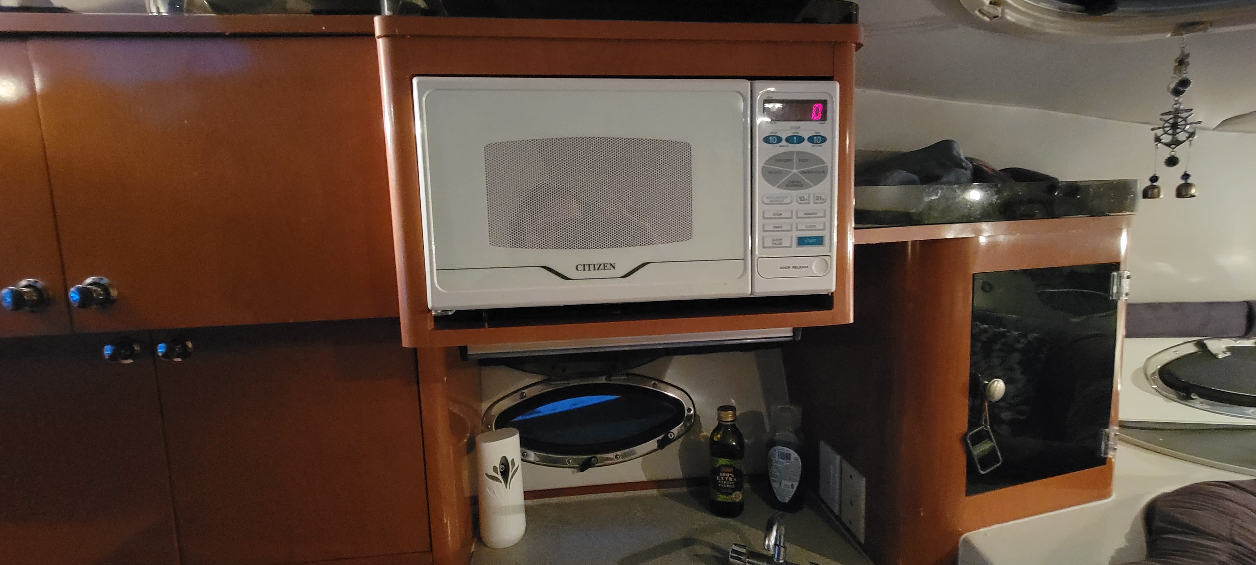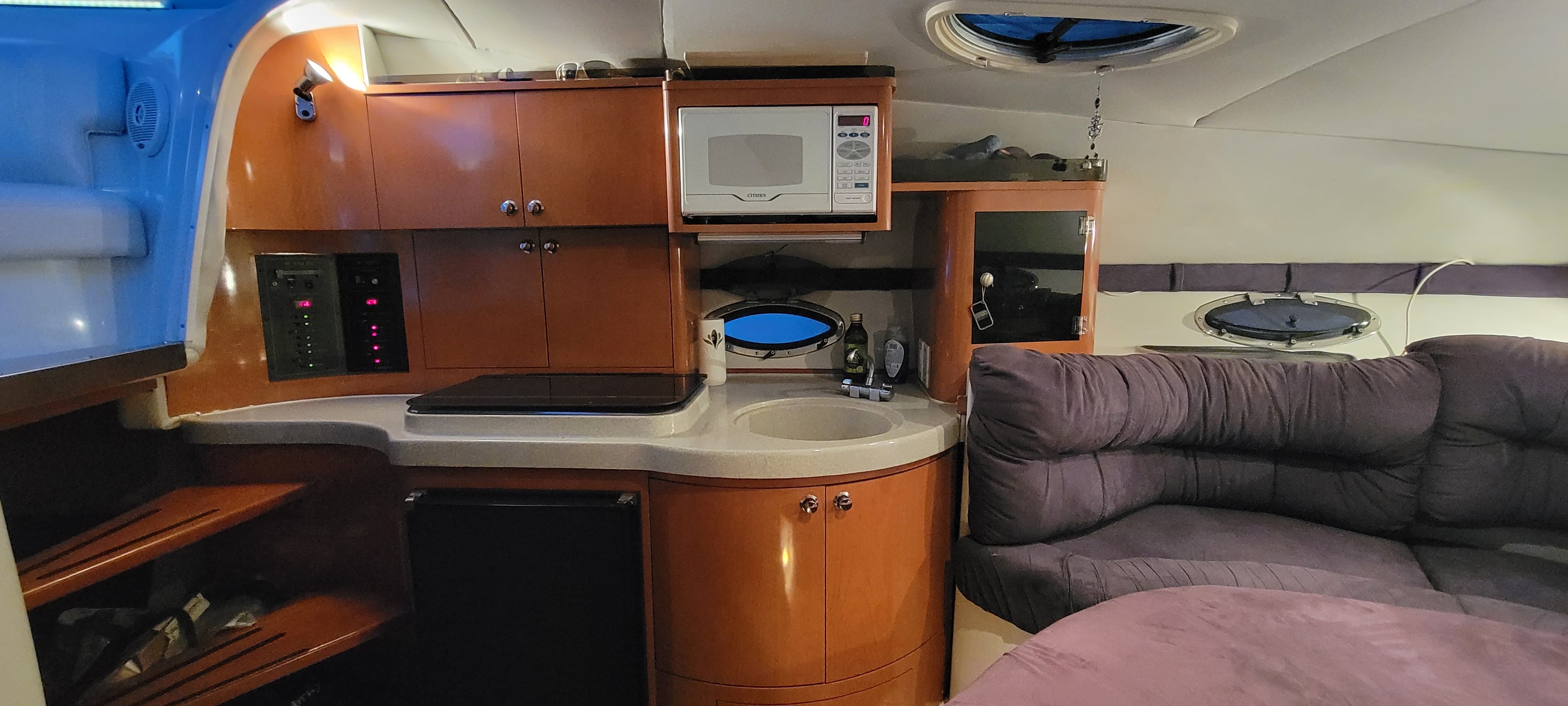 – Galley with microwave, stove, and storage