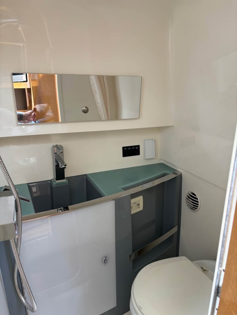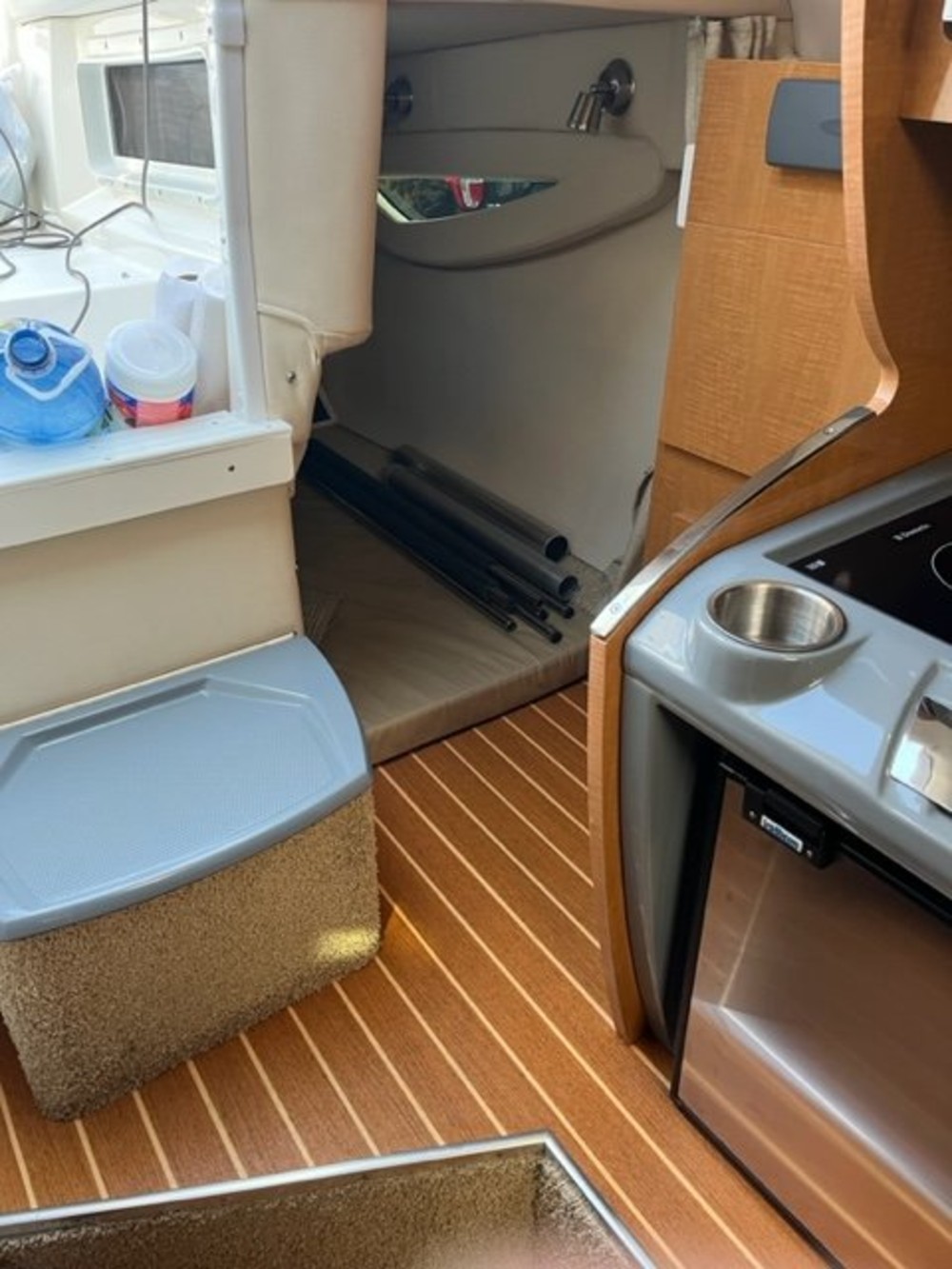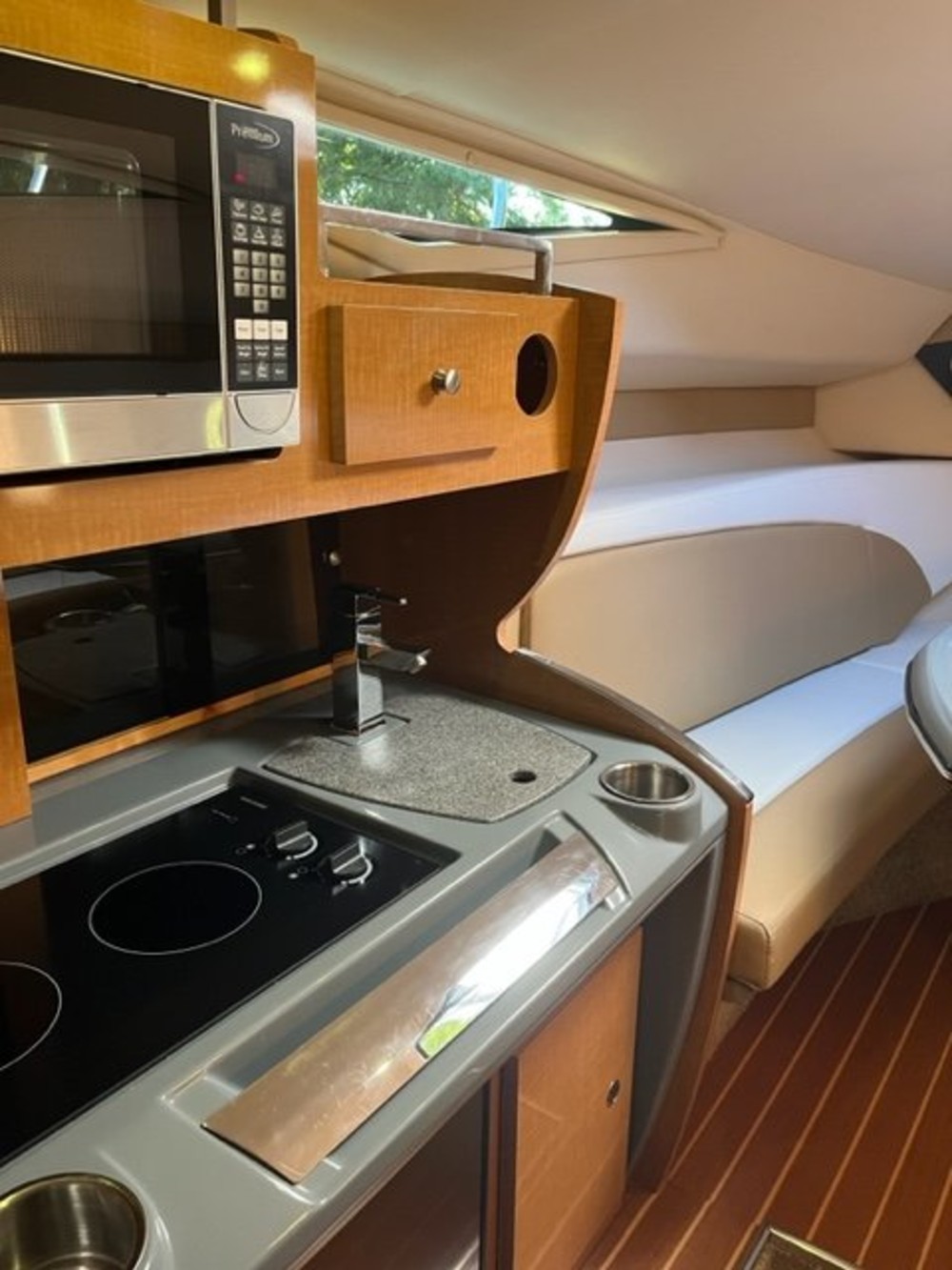 The cabin is well designed to maximize usable space, offering a forward V-berth, mid-cabin berth, and a convertible dinette. The galley is equipped with a sink, refrigerator, and stove, and the enclosed head includes a shower, making the vessel suitable for overnight and weekend use.