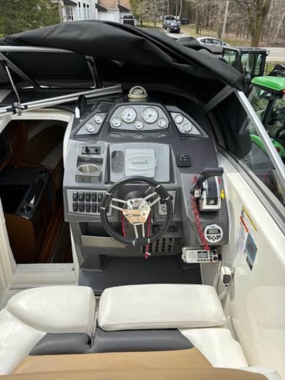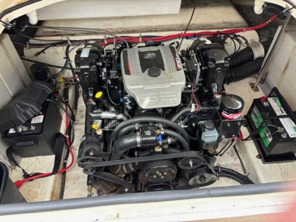 Powered by a MerCruiser 5.7L 350 MAG ECT (300 HP) paired with a Bravo III dual-prop stern drive, the vessel delivers reliable performance, smooth handling, and excellent low-speed maneuverability.