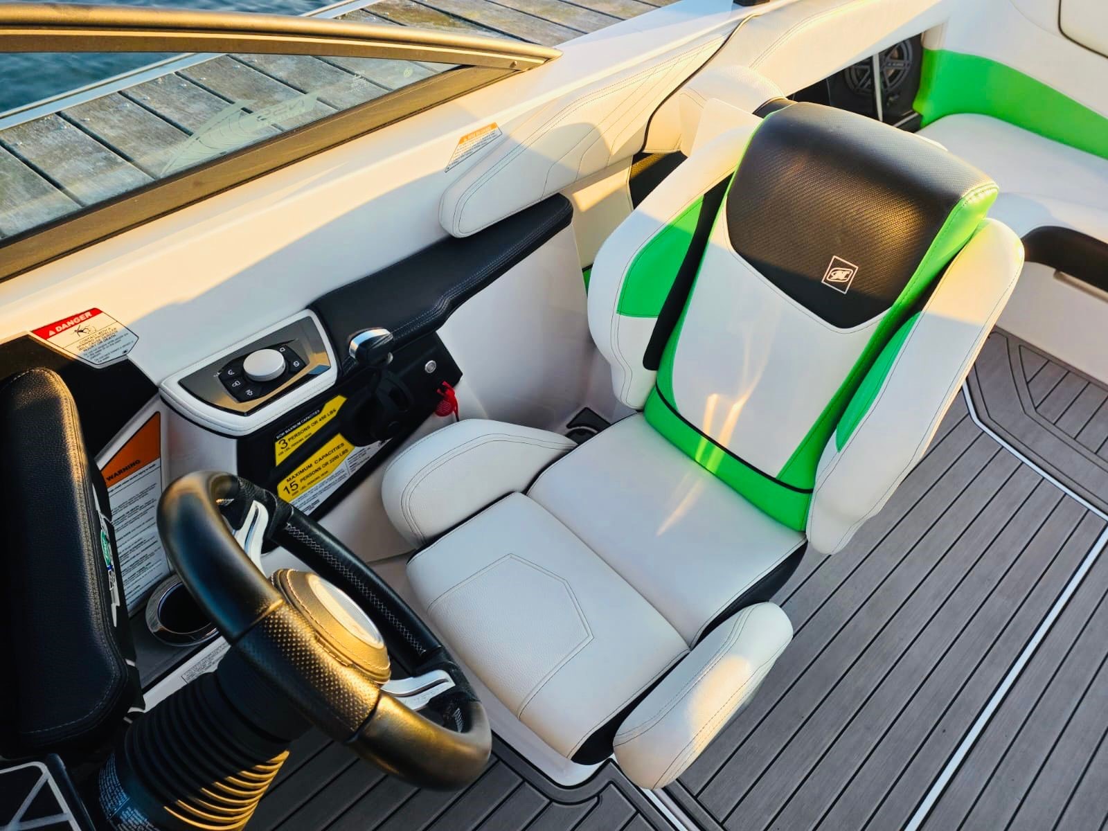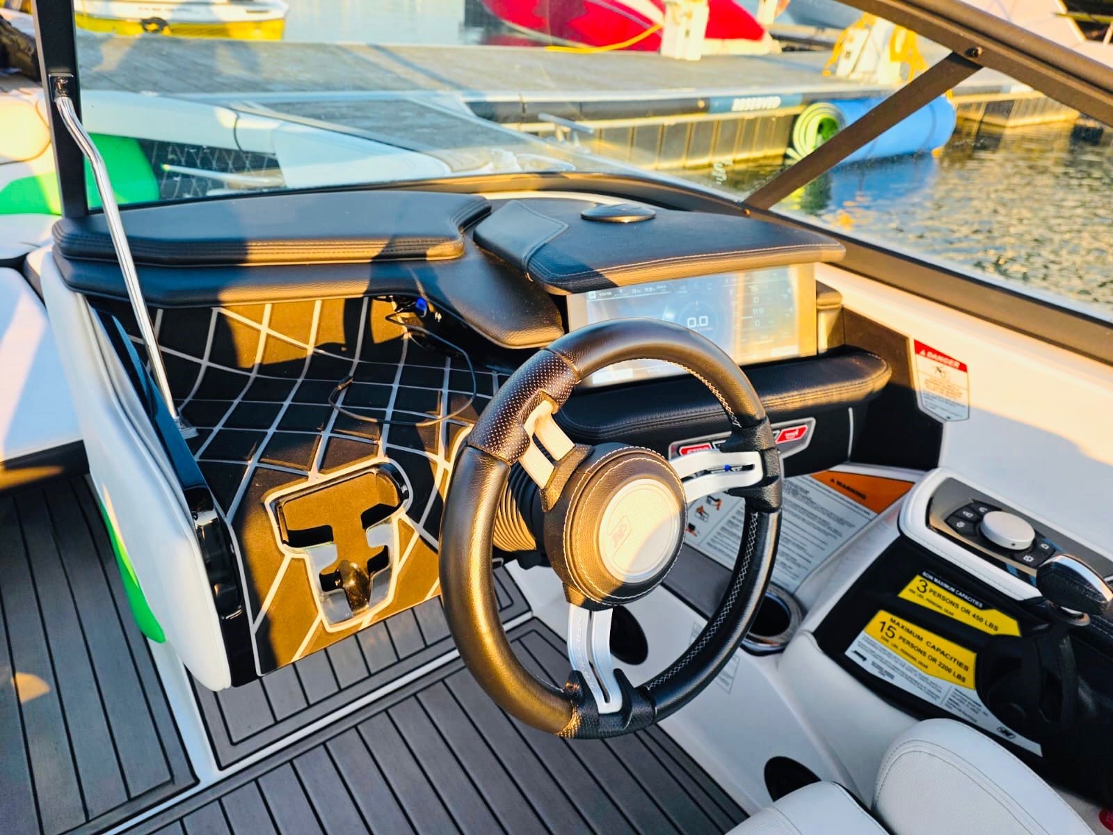 • Premium comfort features: Plush seating, advanced helm controls, heated driver’s seat and loveseat, bow filler cushion, heater with defroster, integrated heater hoses and ultra-premium hand-stitched leather steering wheel and air dam for those cooler, windier days