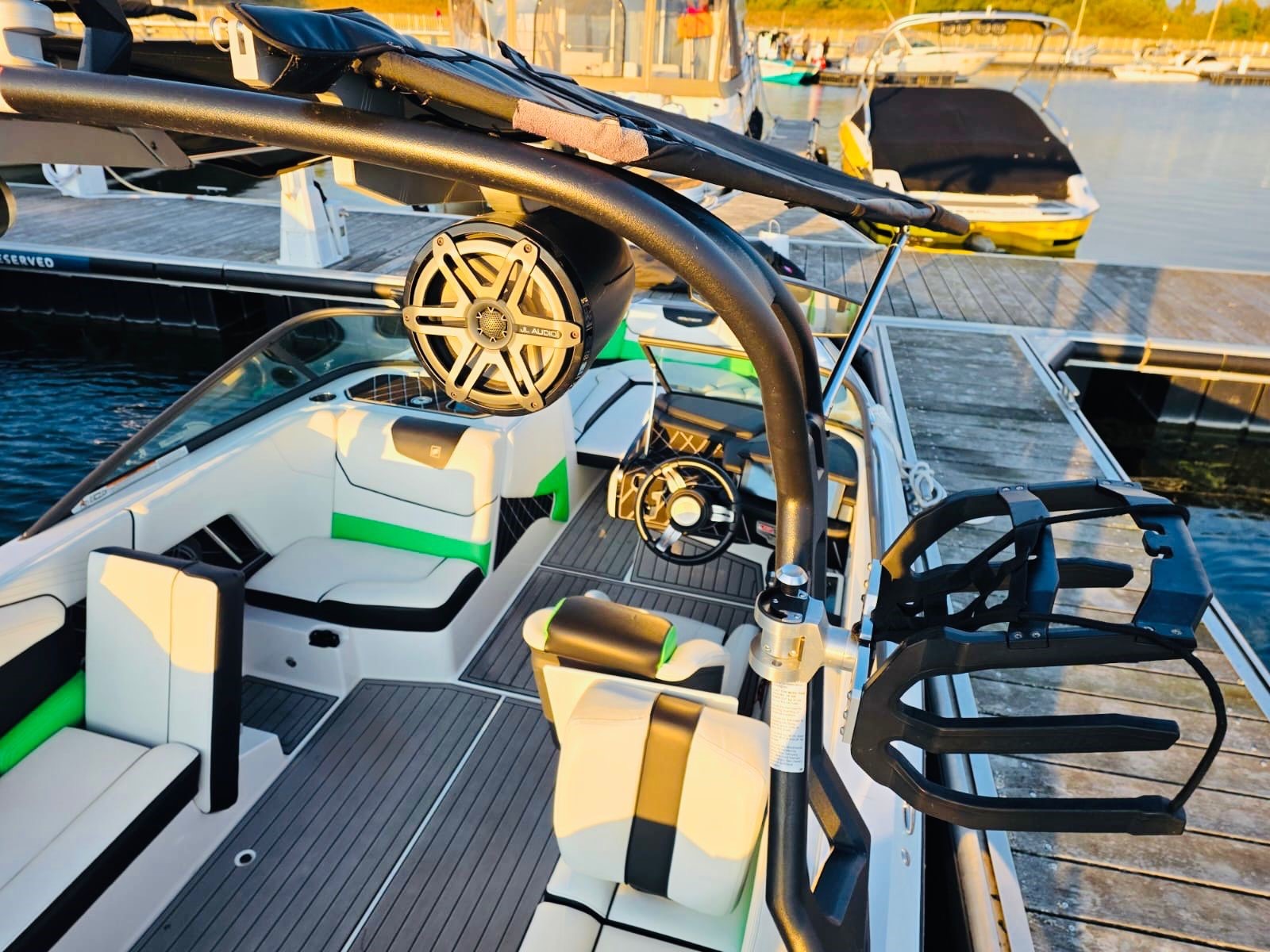 • Convenience: tower-mounted bimini with surf pockets, towable/mooring cover with anti-pooling system, dual-battery maintenance system, retractable ski pylon, Phender Pro fender attachment system and the awareness camera.