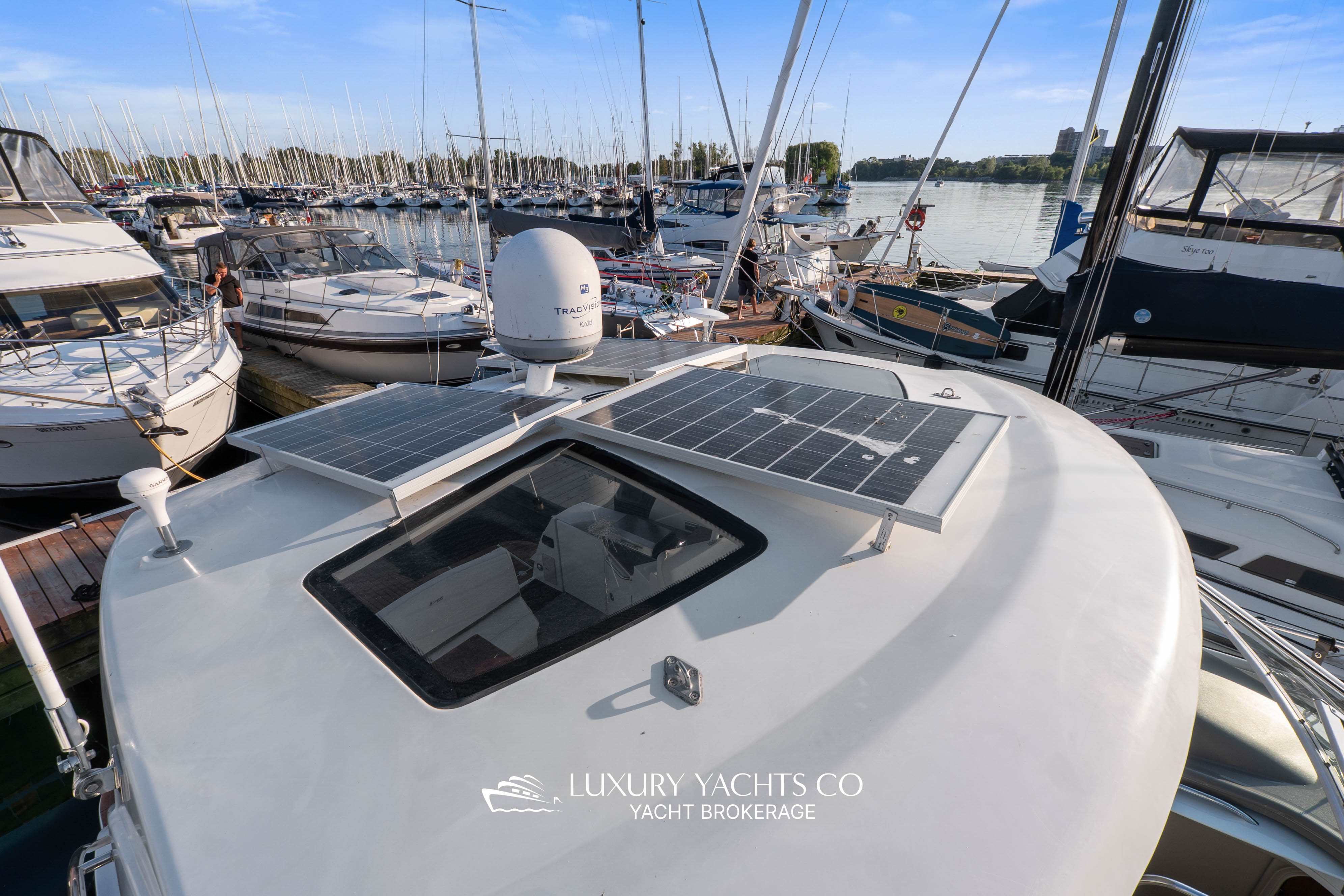 Key upgrades include a remote-controlled dinghy davit system ($15,000), JL Audio premium sound system, solar panel array, new canvas, and more. The IPS joystick system makes docking and maneuvering incredibly simple, even for solo boaters or tight marinas.