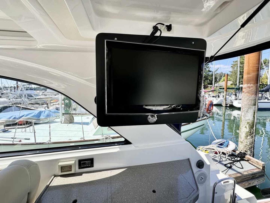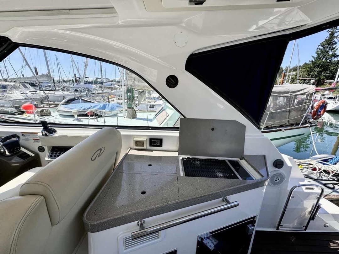 Designed for comfort in all climates, the boat features air conditioning and heat, along with cockpit air, allowing you and your guests to enjoy the space comfortably whether cruising in summer heat or cooler evenings. The cockpit is ideal for entertaining, featuring a built-in BBQ, cockpit refrigerator, and ice maker. Versatile seating includes a stern-facing lounger, perfect for relaxing at anchor or dockside.